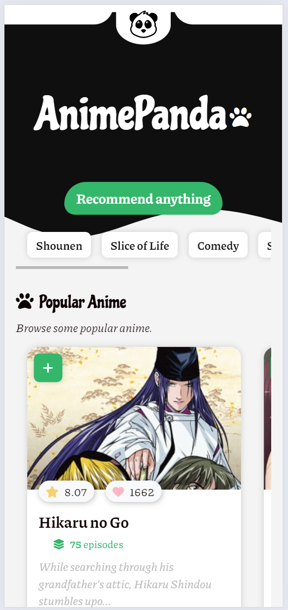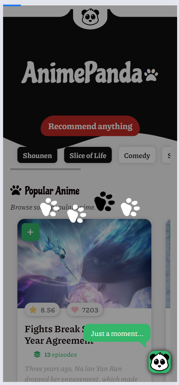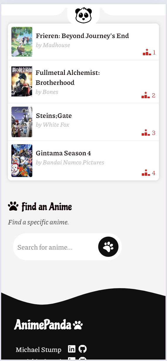 AnimePanda is a mobile first website that utilizes ChatGPT and the MyAnimeList API to find and recommend new anime shows to watch, tailored to the user's preferences and previous watch history. This was our final project of our bootcamp, and was created part-time over the course of a month.