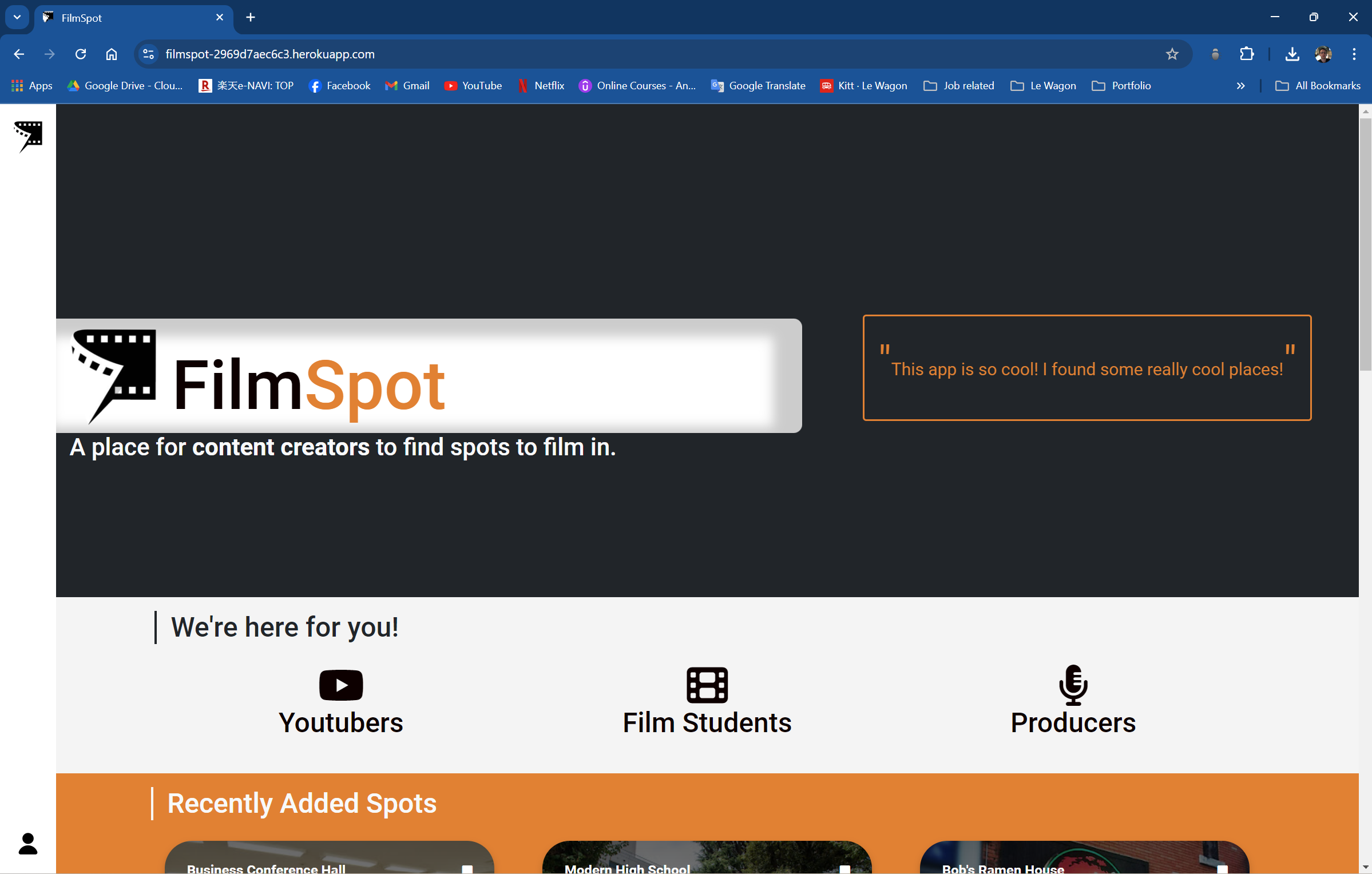 FilmSpot is an AirBnB inspired website where users can register a location, such as their home or restaurant etc... which can then be searched and booked by content creators such as YouTubers. On this project I was the tech lead, so I was responsible for setting up a lot of the back-end as well as managing deployment to Heroku.